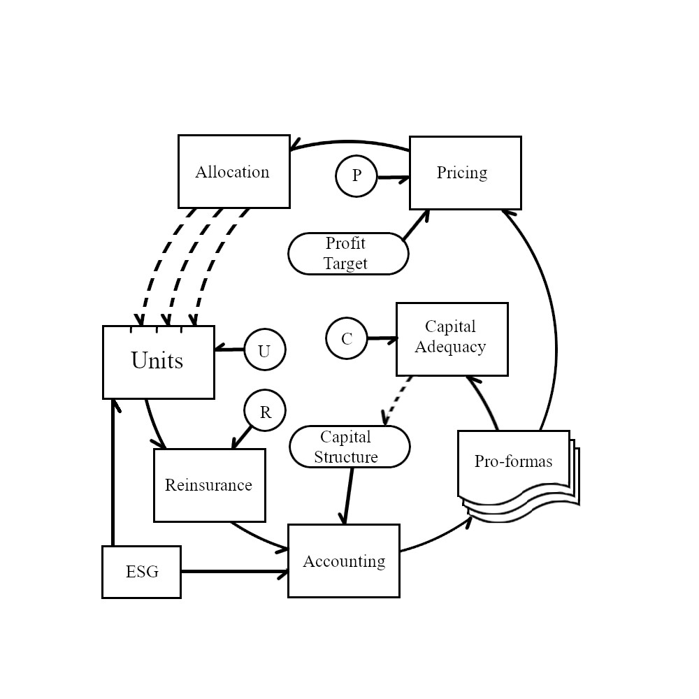 Output from the Business Operations module feeds into the much simpler Capital Adequacy and Pricing & Allocation modules. This is signified by the solid arrows. Dotted arrows signify that these two modules, in turn, affect business operations in the real world and hence, indirectly, the Business Operations module. Indeed, the real-world effect of these modules is the raison d’être of the entire capital modeling system.