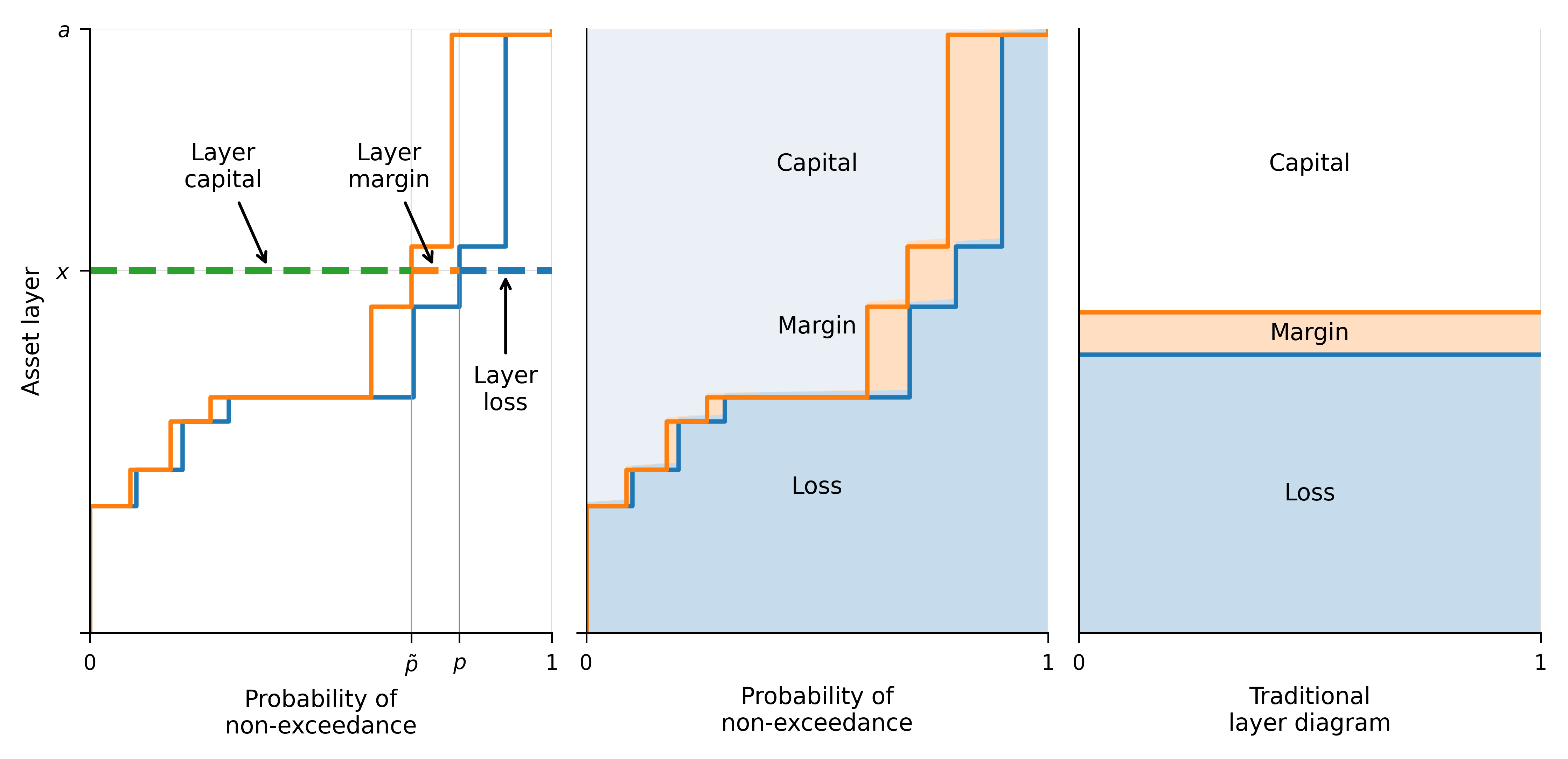 In general, Equation 4.7 can also be used to price any set of outcomes \(Y_k\) that are comonotonic with \(X_k\)—in the sense that it will give the same stand-alone price as the spectral measure. This follows because the ordering of events determined by \(X_k\) gives a nondecreasing ordering of events for \(Y_k\). (The converse may not be true. For example \(Y_k=c\) is constant is comonotonic with \(X_k\), but would admit any ordering of events as nondecreasing.) In our case, each layer is comonotonic with the total, so Equation 4.7 can be seen as an application. In general, the allocation will be less than or equal to the stand-alone price. There is a lower bound too, see chapter 10 of Mildenhall and Major (2022).